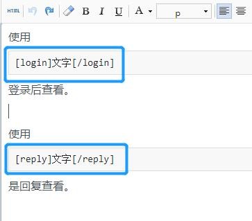 如下图所示,在发表帖子时候,使用[ *** ]来框起来自己需要隐藏的内容就可以发布登录可见或者回复可见的部分了。